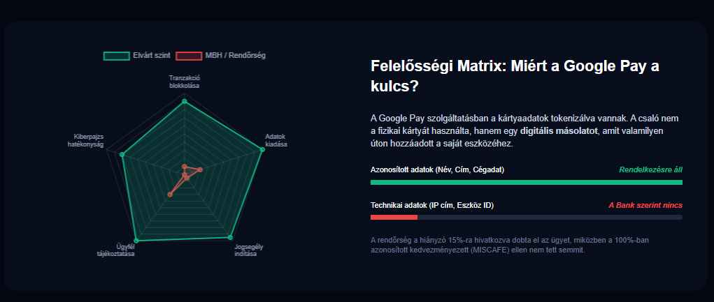 Az MBH Bank felelőssége az adatszolgáltatásban: Ha az MBH Bank azt állítja a rendőrségnek, hogy nem lát IP címet, az azért van, mert a Google Pay tokent fogadták el. Ebben az esetben a bank kötelessége lenne a Google-től bekérni ezeket az adatokat az ügyfél védelmében.