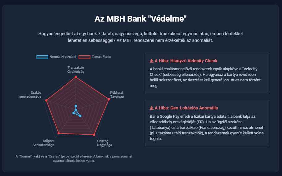 Földrajzi Lehetetlenség (Impossible Travel): A sértett (Tamás) és feltételezhetően a fizikai kártyája Tatabányán tartózkodott, miközben a tranzakciók egy franciaországi („MISCAFE”) terminálon keresztül futottak be. A banki rendszereknek és a Google Pay geolokációs adatainak azonnal érzékelniük kellett volna a fizikai eszköz és a tokenizált fizetés helyszíne közötti diszkrepanciát.