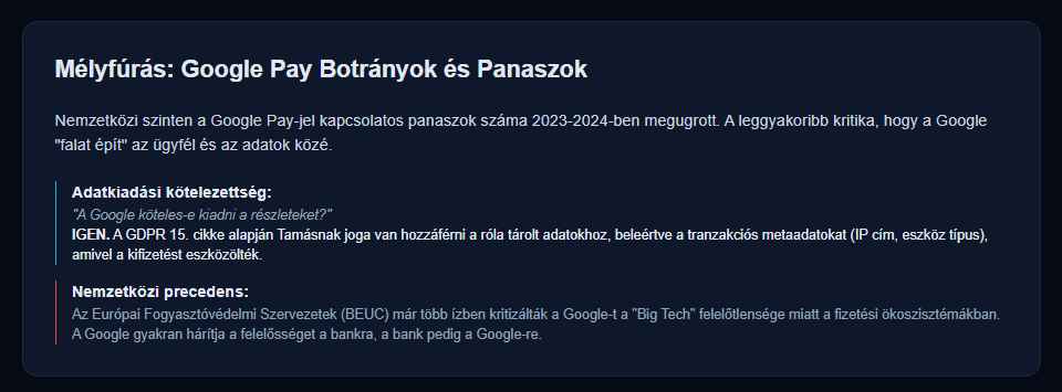 Ez a rész a cikkünk legkritikusabb eleme: a Google Pay nem csupán egy passzív eszköz, hanem a csalás aktív, technológiai facilitátora. A felhasználó hipotézise, miszerint a Google-nek szerepe van a csalásban, műszakilag és jogilag is alátámasztható. A Google meg tudta volna gátolni a csalást, de nem tette meg!