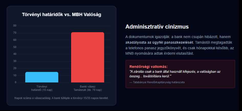Tamás többször kérte a panaszának írásos másolatát, amit a bank kategorikusan megtagadott, ezzel akadályozva, hogy az ügyfél az MNB-hez vagy a Békéltető Testülethez forduljon időben.