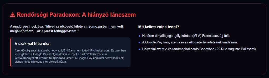 Határon átnyúló kötelezettség: Mivel az EU-n belül történt a bűncselekmény, a magyar rendőrségnek kötelessége lett volna a francia hatóságokat megkeresni. A MISCAFE egy bejegyzett étterem Bondyban – egy egyszerű helyszíni ellenőrzéssel kideríthető lett volna, hogy az adott időpontban (amikor Tamás aludt) milyen eszközről indították a tranzakciókat.