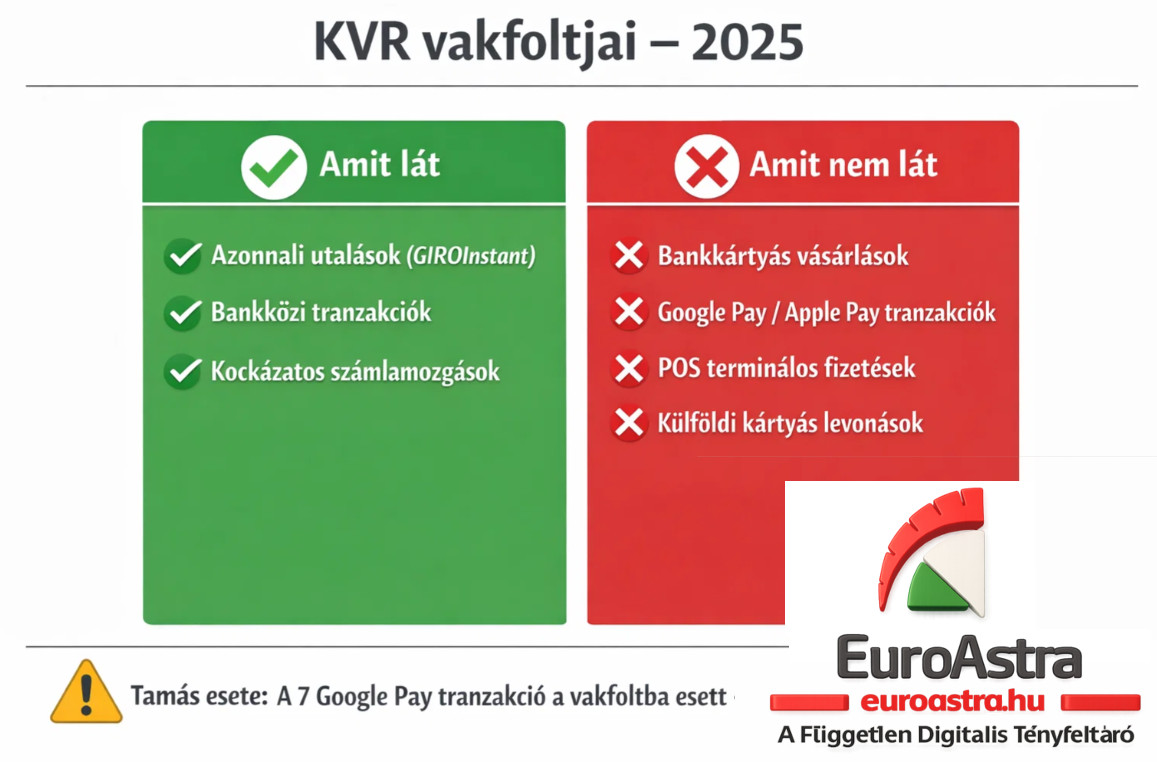 Tamás életében ez a vakfolt a következmény: Amikor a csalók a „MISCAFE” terminálján keresztül Google Pay-jel fizettek, ez kártyás tranzakciónak minősült. A KVR szenzorai ezt nem érzékelték, mert a rendszer az utalások (számlaszámról számlaszámra) figyelésére lett optimalizálva az induláskor. Ez egy rendszerszintű stratégiai hiba volt a szabályozó részéről, hiszen a csalók 2024-től kezdve tömegesen tértek át az utalásos csalásokról a kártya-digitalizációs (tokenizációs) csalásokra, éppen a szigorodó utalási kontrollok miatt. A KVR tehát „az előző háborúra” készült fel.