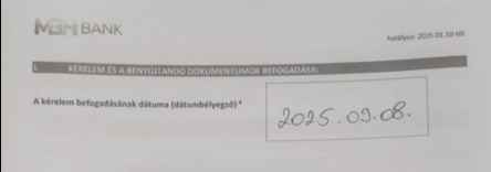A befogadási dátum 2025.09.08. – ez az okirat tartalmaz még egy pontot: nevezetesen ez a bankfiókban került átadásra, csak hát ez a fránya papír amit kitöltöttek és átadtak: eltűnt…