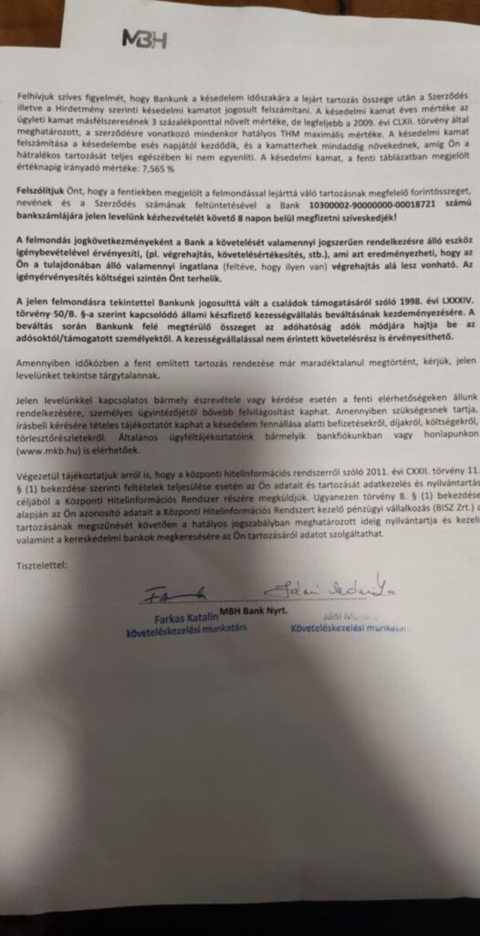 A születés után nem érkezett figyelmeztetés a banktól. A törlesztés egy idő után nem vonódott le, Amáliáék azt hitték, szüneteltetés lép életbe. Majd hirtelen jött a levél: közel 1,9 millió forint azonnali visszafizetés. Röviddel utána szerződésfelmondás (több mint 9,7 millió forint követelés), végrehajtási fenyegetés, és KHR-listázás.