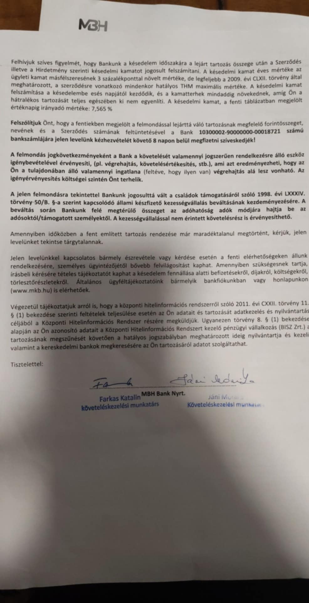 2025 októberében az MBH Bank botrányosan felmondta a szerződést, 9,7 millió forint azonnali tartozást követelve. Ezzel párhuzamosan KHR-be tették őket „adós/tartozás” minősítéssel.