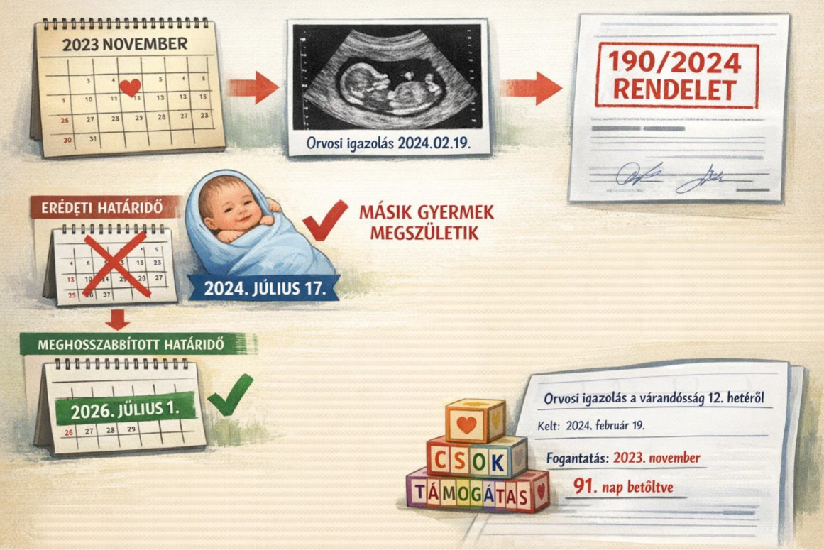 A második gyermek 2024. július 17-én született, ami az eredeti határidő szerint (2024 október) túl lett volna, de a 190/2024-es rendelet miatt bőven a meghosszabbított 2026. július 1-i határidőn belül van. A várandósság 12. hetét igazoló orvosi dokumentum 2024. február 19-én kelt, egyértelműen rögzítve a fogantatást (2023 november körül) és a 91. nap betöltését, ami a támogatás jogosultságát alapozza meg.