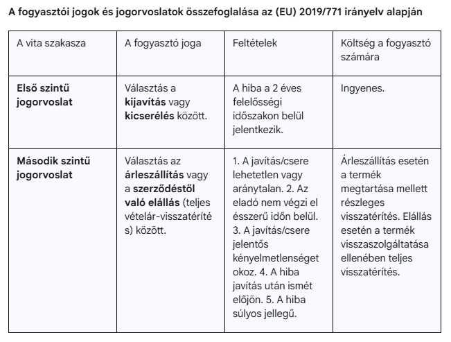 Az alábbi táblázat összefoglalja a fogyasztók jogait és jogorvoslati lehetőségeit az EU jogszabályai alapján, amely praktikus útmutatóként szolgálhat egy vitás helyzetben.