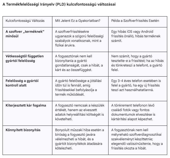 Objektív, vétkességtől független felelősségi rendszert vezet be. Ez azt jelenti, hogy ha egy fogyasztó kárt szenved (beleértve az adatvesztést vagy pszichés sérelmet) egy hibás szoftverfrissítés miatt, nem kell bizonyítania a gyártó gondatlanságát, csupán azt, hogy a frissítés hibás volt és kárt okozott.
