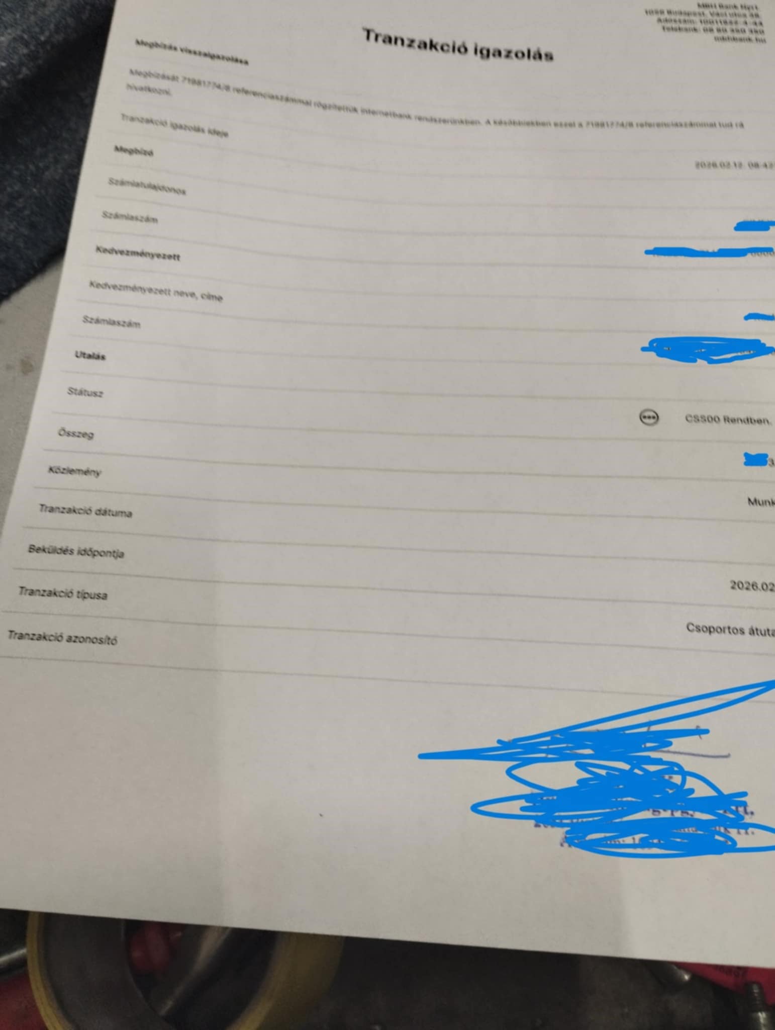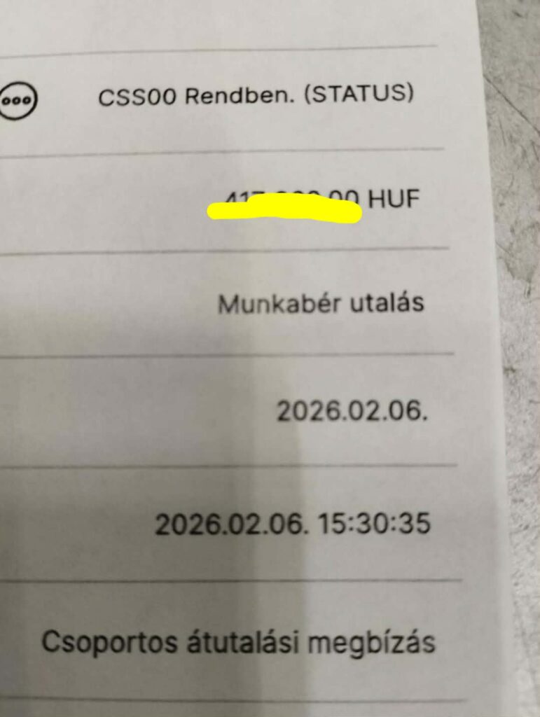 A sok bizonytalanság után bementek a bankba és kértek igazolást arról, hogy 12-én sincsen meg apénz amitelutaltak 2026.február 6-án. 2 tucat dolgozó várja a bérét….
