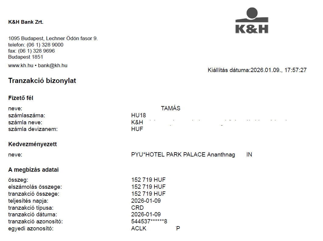 A megtévesztés sajnos sikeres volt. A hamis oldalon, amely megszólalásig hasonlított a hivatalos felületre, Tamás megadta kártyaadatait. A K&H Bank bizonylataiból feketén-fehéren látszik a lopás: míg a cél Prága volt, a pénz egy „PYU*HOTEL PARK PALACE Ananthnag IN” nevű, indiai (IN) számlára érkezett meg 2026. január 9-én. Az összeg: 152 719 forint.