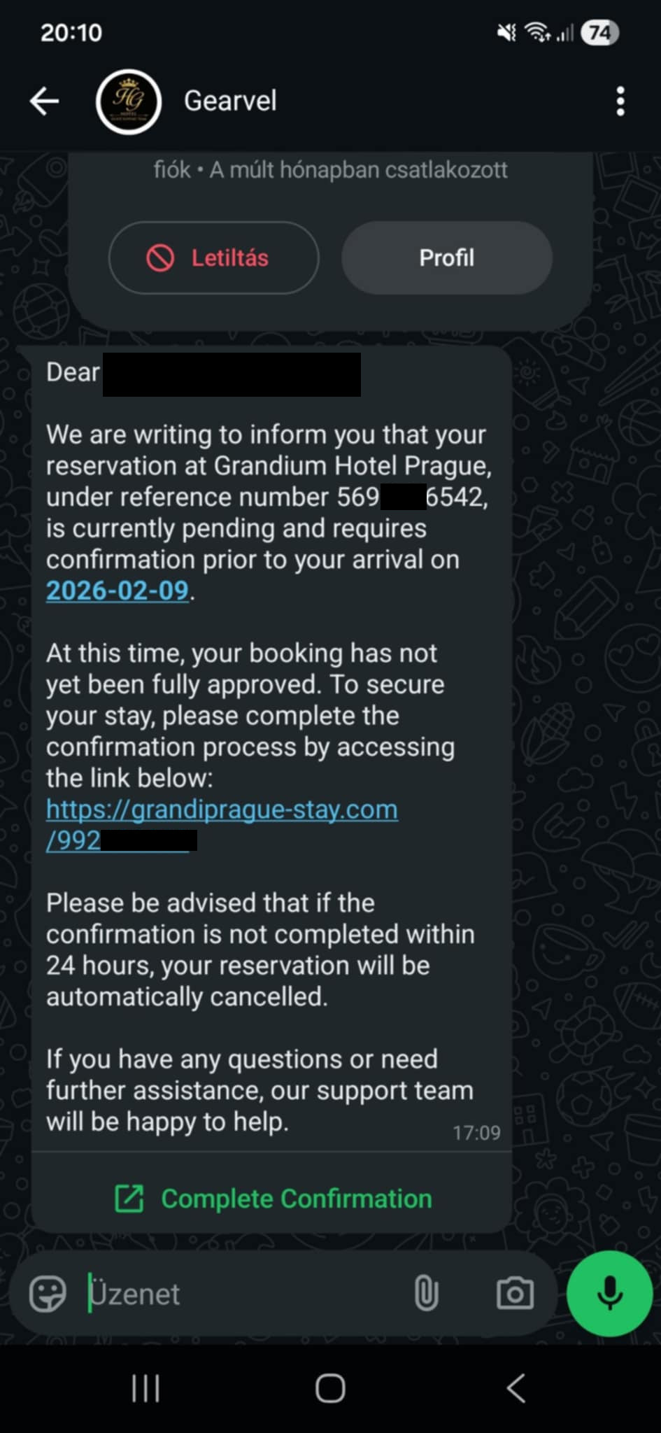 A történet úgy kezdődött, mint bármelyik normális utazás: Tamás szobát foglalt a prágai Grandium Hotelbe a Booking.com-on keresztül. Pár nappal később azonban egy WhatsApp üzenetet kapott egy „Gearvel” nevű, üzleti fiókként regisztrált profiltól, amely a szálloda logóját használta. Amiért ez a csalás rendkívül veszélyes, az a tökéletes hitelesség.