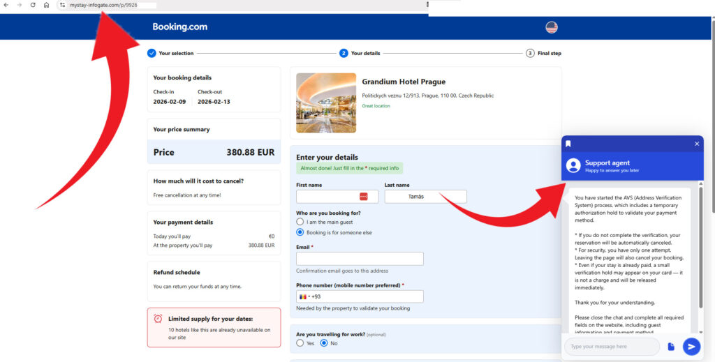 A csalók azt állították, hogy a foglalás „függőben van”, és ha 24 órán belül nem igazolja a kártyaadatait egy megadott linken, a rendszer automatikusan törli a prágai szállását.