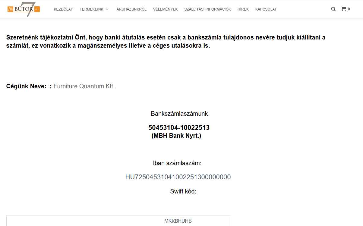 Egy rövidke keresés után az e-cégjegyzékben olvasható, hogy a BUTOR7.HU weboldalon megadott 50453104-10022513 (MBH Bank Nyrt.) számlaszámra kérik az utalásokat, a vásárlás ellenértékeként.