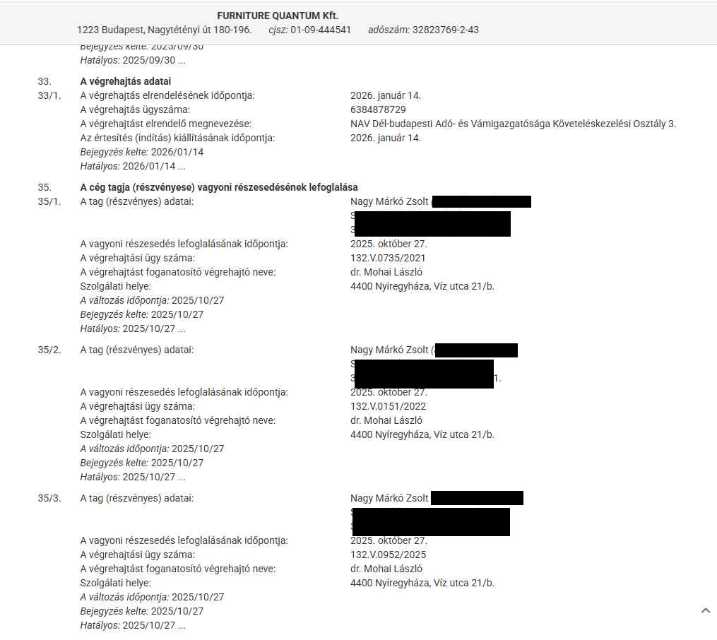 Innen egy fél görgetéssel előkerült a jelenlegi hatályos intézkedések sora a Furniture Quantum kft-vel szemben, ami kot adhat a pénzt „máshová” gyűjteni