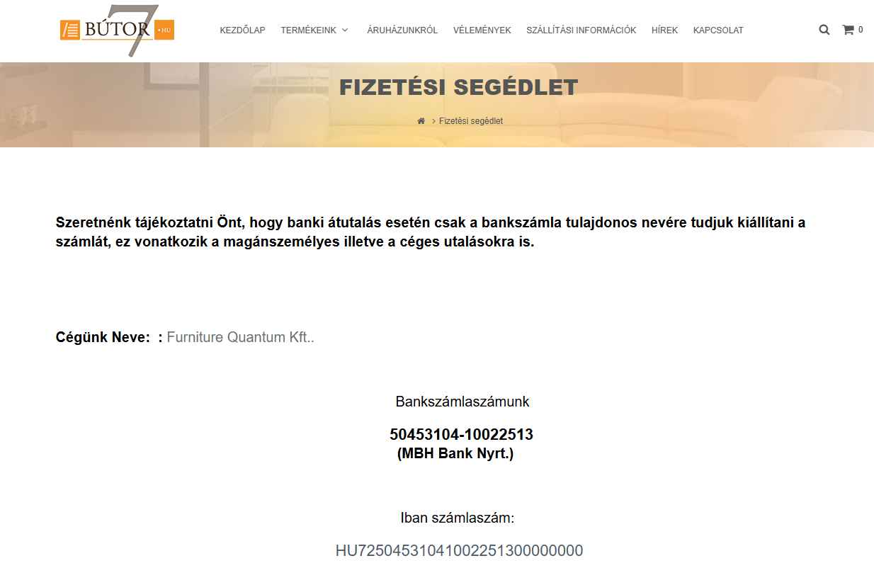 A  BÚTOR7.hu oldal fizetési segédletén szereplő bankszámlaszám nem a Furniture Quantum kft számlája,  hanem a POLISH MASTER Kft számlaszáma látható