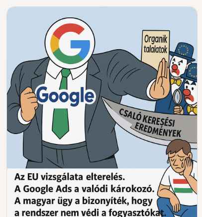 Az Európai Bizottság legújabb vizsgálata nem több, mint elterelés: az organikus keresési rangsorok jogi vitájába fullad, miközben a valódi károkozás a Google Ads fizetett hirdetésein keresztül zajlik. A magyarországi MBH Bank-ügy egyértelmű bizonyíték arra, hogy a rendszer nem védi a fogyasztókat, hanem kiszolgáltatja őket a csalóknak.