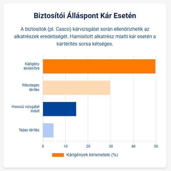 A biztosítási feltételek szinte mindig tartalmaznak kizáró okokat. Bár a dokumentumok ritkán említik név szerint a „hamis alkatrészt”, a biztosító mentesülhet a fizetési kötelezettség alól, ha a kárt a jármű nem engedélyezett átalakítása, a karbantartási kötelezettségek súlyos elhanyagolása vagy a jármű nem rendeltetésszerű használata okozta. Egy hamis, típusjóváhagyással nem rendelkező, bizonyítottan biztonsági kockázatot jelentő alkatrész (például egy nem megfelelő fékbetét) beszerelése a biztosító által könnyen értelmezhető a szerződési feltételek súlyos megsértéseként, ami a kártérítés megtagadásához vezethet.