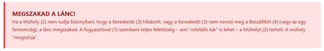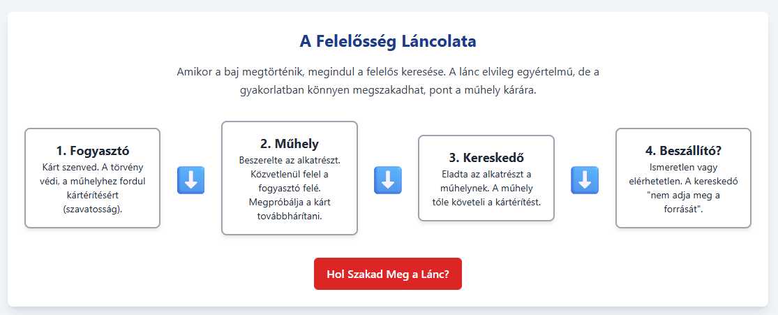 Amikor egy hamis alkatrész katasztrófát okoz, a legbonyolultabb kérdés a felelősség megállapítása. A tipikus ellátási lánc a gyártótól az importőrön, a nagy- és kiskereskedőn át a szervizig, majd a fogyasztóig tart. A hamisítványok esetében azonban ez a lánc már az elején megszakad, hiszen a „gyártó” általában egy ismeretlen, elérhetetlen entitás.