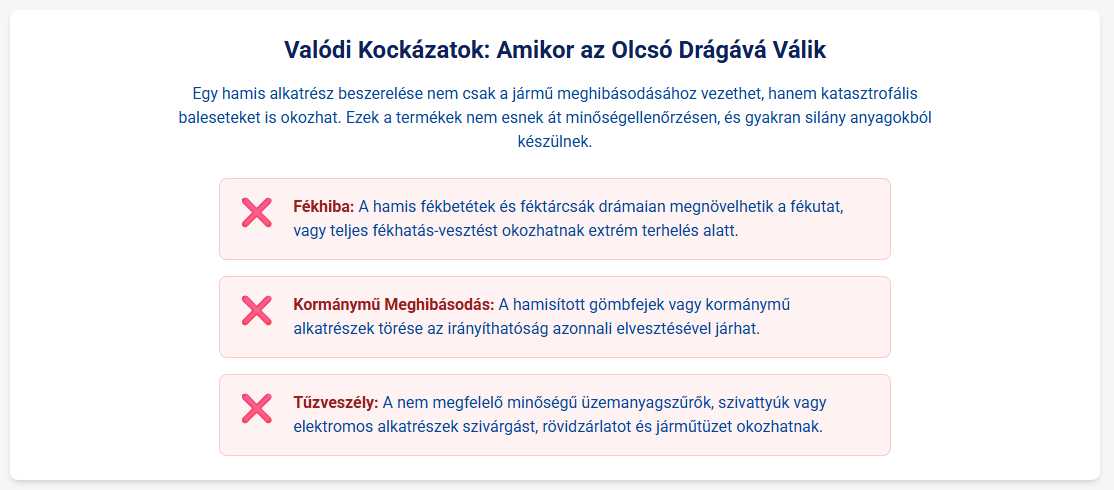 Egyetlen hamis alkatrész meghibásodása ritkán marad elszigetelt esemény. Sokkal inkább egy dominóeffektust indít el, amely más, eredetileg hibátlan és drága rendszereket is tönkretesz. Vegyünk egy hamis olajszűrőt, amellyel a tulajdonos megspórol pár ezer forintot. A szűrő nem látja el a feladatát, a fémrészecskék csiszolóanyagként keringenek a motorban, tönkretéve a csapágyakat, a hengerfalat és a vezérműtengelyt. A végeredmény egy több százezer vagy akár milliós motorgenerál. A csekély megtakarítás egy nagyságrendekkel nagyobb kárt okozott. A hamis alkatrész vásárlása tehát nem egy egyszerű rossz üzlet, hanem egy rendkívül magas kockázatú pénzügyi hazárdjáték, ahol a lehetséges veszteség messze meghaladja a remélt nyereséget.
