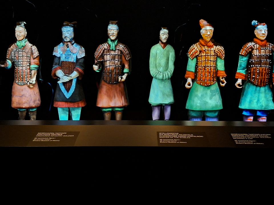 A kiállítás kurátora Fajcsák Györgyi sinológus, a Hopp Ferenc Ázsiai Művészeti Múzeum igazgatója ezt még azzal egészítette ki, hogy mindaz, amit bemutatunk, az etalon, mérvadó a kínai művészetben, a kínai kultúrában. Olyan sírrekonstrukció bemutatásra vállalkoztunk, ami egészen egyedülálló. Az első kínai császár sírkertje látható, egészen újfajta látványtervvel, magyarázó szövegekkel, illetve az alaprajzi elrendezéssel, térbe helyezve. A terrakotta hadsereg híres katonái itt állnak mellettünk és rajtuk nagyon jól látszik, hogy az eredeti színeiket meglehetősen visszafogottan hordozzák. Ennek a színfestésnek a rekonstrukciójára is vállalkoztunk egy teljesen külön térben, ahol háromdimenziós másolatokra rávetítjük az öltözékek valódi színeit. Ezzel eddig sehol máshol nem próbálkoztak. Világújdonság, csak itt látható!