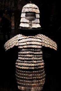 A feltárás helyszínén, az ásatások során nemcsak az agyagkatonák sokasága került elő. Eltemették velük a szükséges felszerelést is. Pontos ismereteket nyerhetünk általuk a kor haditechnikájáról. A kőpáncélok sírjából 90 páncélruha és 43 páncélsisak jött a felszínre. Valamennyit szépen vágott és finomra csiszolt zöld mészkőlapokból állították össze, rézhuzalok segítségével. Mesteri az elkészítésük, mely mind a méreteket, mind az összeállítás technikáját tekintve pontosan követi a bőrből és vasból készített valódi páncélok kialakítását. Egy sisak 74 különböző méretű kőlapból áll, 3,8 kilót, a páncélruha pedig 612 lapból áll és 20 kilót nyom. Kizárólag a temetkezés céljára készítették őket, hiszen a súlyuk és törékeny mivoltuk nem tette volna lehetővé valódi páncélként harcban viselni őket. A kiállításon viszont látható ilyen. A császári sírkert építői – volt rá idejük – természethű megjelenítésre törekedtek. Olyan legyen, amiben a császár lelke jól érzi magát. Érthető, hogy vadaskert is tartozott hozzá. A feltárás során előkerült egy bronzból öntött vadlúd is.