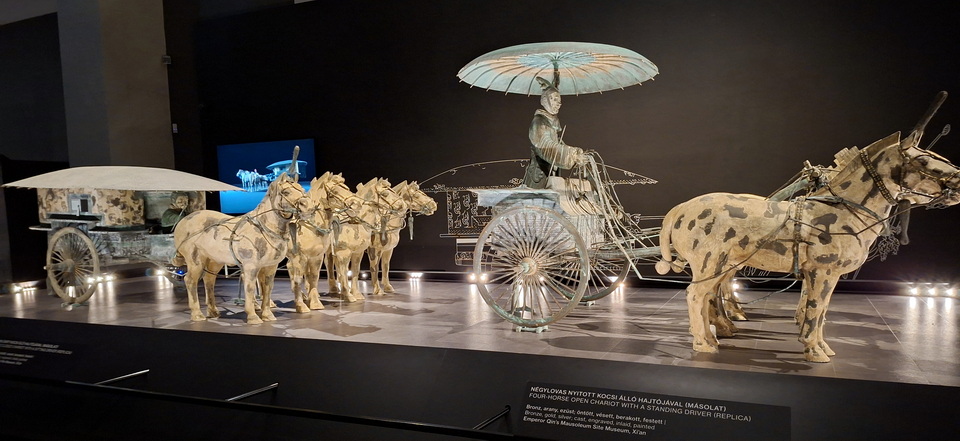 A kiállításán nyomon követhetjük a Csín Királyság, majd Birodalom több évszázados felemelkedését a Kr. e. 8.-3. század között, és találkozhatunk e kor fontos szertartási tárgyaival, jelképeivel. A császár, Csin Si Huangti nagy eltökéltséggel kutatta az öröklét titkát, amelynek különösen szép tárgyai, a túlvilágra vivő lovaskocsik is bekerültek sírjába, és most a budapesti kiállítás anyagába. Ezek viszont nem eredetiek, pontos másolatok. Oly ritka régészeti leletek és a restaurálás után is olyan féltett kincsek, hogy még soha nem hagyták el a megtalálás helyén, Shenszi tartományban álló múzeumukat. Ám ebből a múzeumból még számos olyan tárgy érkezett Budapestre, melyek a birodalom mindennapi működésébe is bepillantást engednek. Feltárul Kína dinasztikus történelmének meghatározó korszaka.