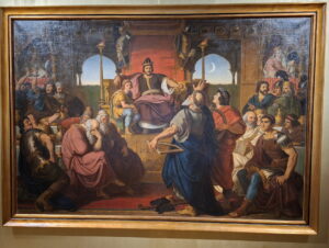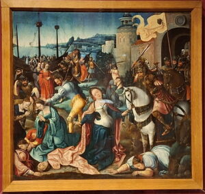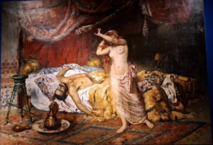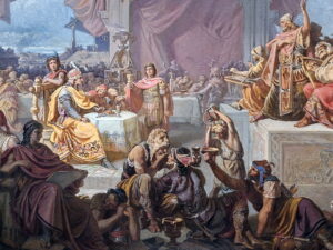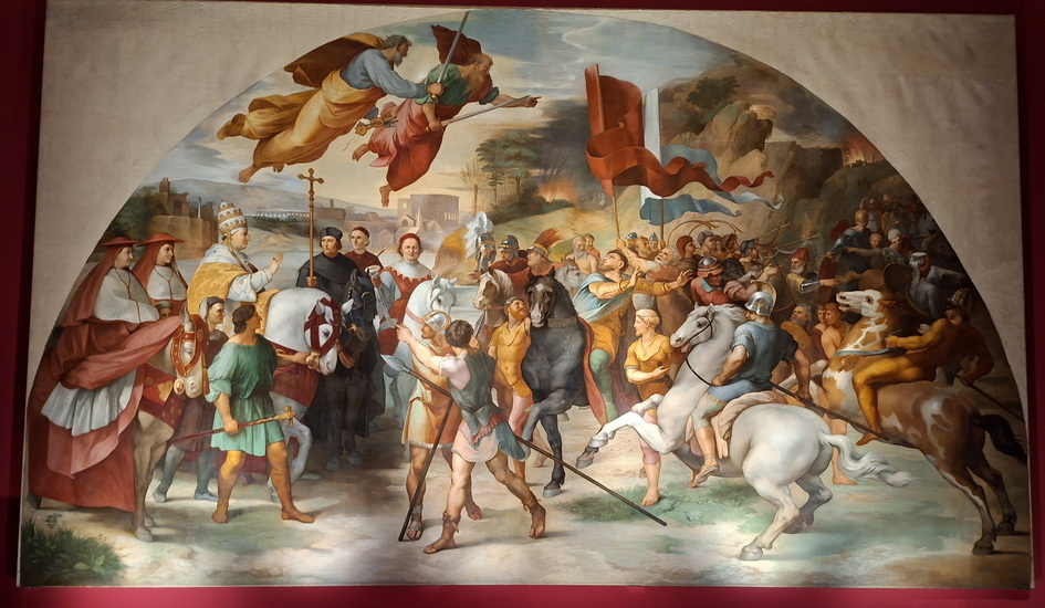 Árnyalva a vadság történetét, megjelenik az I. Nagy Szent Leó pápával való találkozás, mely 452-ben valóban megtörtént, de a részletek körül több a legenda, mint a bizonyított tény. Számunkra ezt a kiállítás legnagyobb műtárgya, „Nagy Leó találkozása Attilával Róma falai alatt” című festménye teszi hangsúlyossá. A monumentális, több mint 4 x 6 méteres festmény, másolat. Haan Antal 1874-81 között a Vatikánban másolta le Raffaello három Stancáját, köztük ezt is – közel eredeti méretben. Attila 452-ben sikeres hadjáratot vezetett Itáliában. Róma város békét kérő követségének volt tagja a pápa, valószínű, hogy a kegyelem ára dófizetés lehetett. Százhúsz év után most először láthatja a hazai és a nemzetközi közönség ezt a képet, de sokkal közelebbről, mint a Vatikánban. Tehát jobban meg lehet vizsgálni. Jó egy évnyi komoly restaurátori munka eredménye, műszeres méréseket is végeztek, mivel hosszú évtizedeken keresztül fel volt tekerve. Most szinte teljesen újszerű állapotban látható. Persze érdemes a történeti pillanatot is elképzelni, vagy legalábbis picit elemezni. Raffaello a szereplőket – Attilát tévesen, pikkelypáncélt viselve – a festés korának megfelelő ruhában ábrázolta. Ezért raktak a rendezők most a kép mellé egy egészen máskor keletkezett szarmata páncélt. Akkoriban ebbe a viseletbe képzelték. Hasonló eltéréseket látni a kiállítás számos más pontján. Hogy amikor előkerülnek leletek a régi korokból, akkor azokat felhasználva helyezik bele az ismert szereplőket a régi időszakba.  Mindez megmutatkozik egy másik, ugyancsak híres képen. Mint egész életét, úgy Attila halált is több, különféle legenda övezi. Paczka Ferenc 1884-ben erről festet képe nagy feltűnést keltett, de nem az uralkodó naturalista módon festett holtteste, hanem a főszereplővé tett Ildikó szexualizált bemutatása miatt. Ma pontosan látjuk, a festő csalt: a képen olyan részletek szerepelnek, amik nem léteztek Attila korában. A kiállítás rendezői itt is gondoskodtak arról, hogy a képet nézve, bal oldalon a falon, illetve mellette egy tárlóban sorakozzanak a bizonyítékok. Az ágynál álló háromlábnak támasztva hever egy bárd. A szomszédos vitrinben is ott van, a XIX. század eleji perzsa dervis bárd. Nem hun, nem ókori. A falon ugyancsak egy XIX. századi szőttesminta látható, pont olyan mintákkal, mint a képen, az Attila ágya melletti kárpiton. Sok ilyen érdekes ismerettel gazdagodhat, aki július 12-ig felkeresi a Nemzeti Múzeum valóban párját rikító legújabb kiállítását.