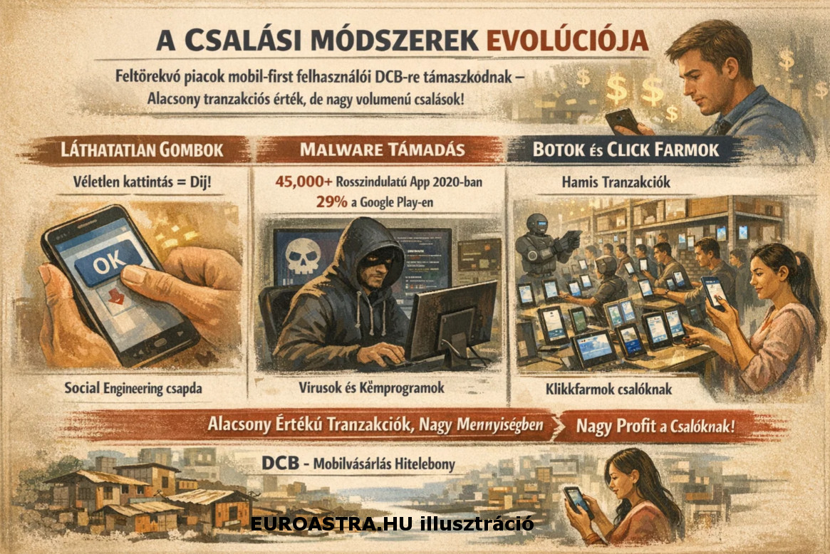 Csalási módszerek evolúciója: Csalók gyakran használják social engineeringet (pl. „láthatatlan gombok” appokban, amik véletlen kattintással aktiválnak terhelést), malware-t (45 000+ azonosított rosszindulatú app 2020-ban, 29% Google Play-en), vagy botokat/click farmokat hamis tranzakciókhoz. Ez különösen feltörekvő piacokon gyakori, ahol a mobil-first felhasználók függnek a DCB-től, és alacsony az átlagos tranzakcióérték, de nagy volumenben nyereséges a csalóknak.